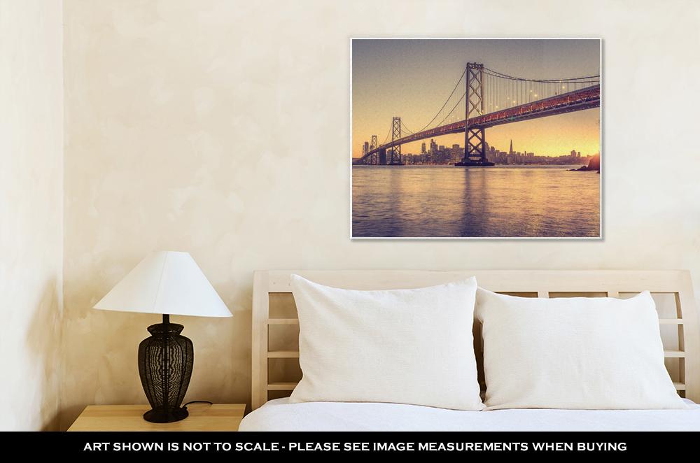 The artist who provided this image described the image in this way: Classic panoramic view of San Francisco skyline with famous Oakland Bay Bridge illuminated in beautiful golden evening light at sunset in summer San Francisco Bay Area California USA